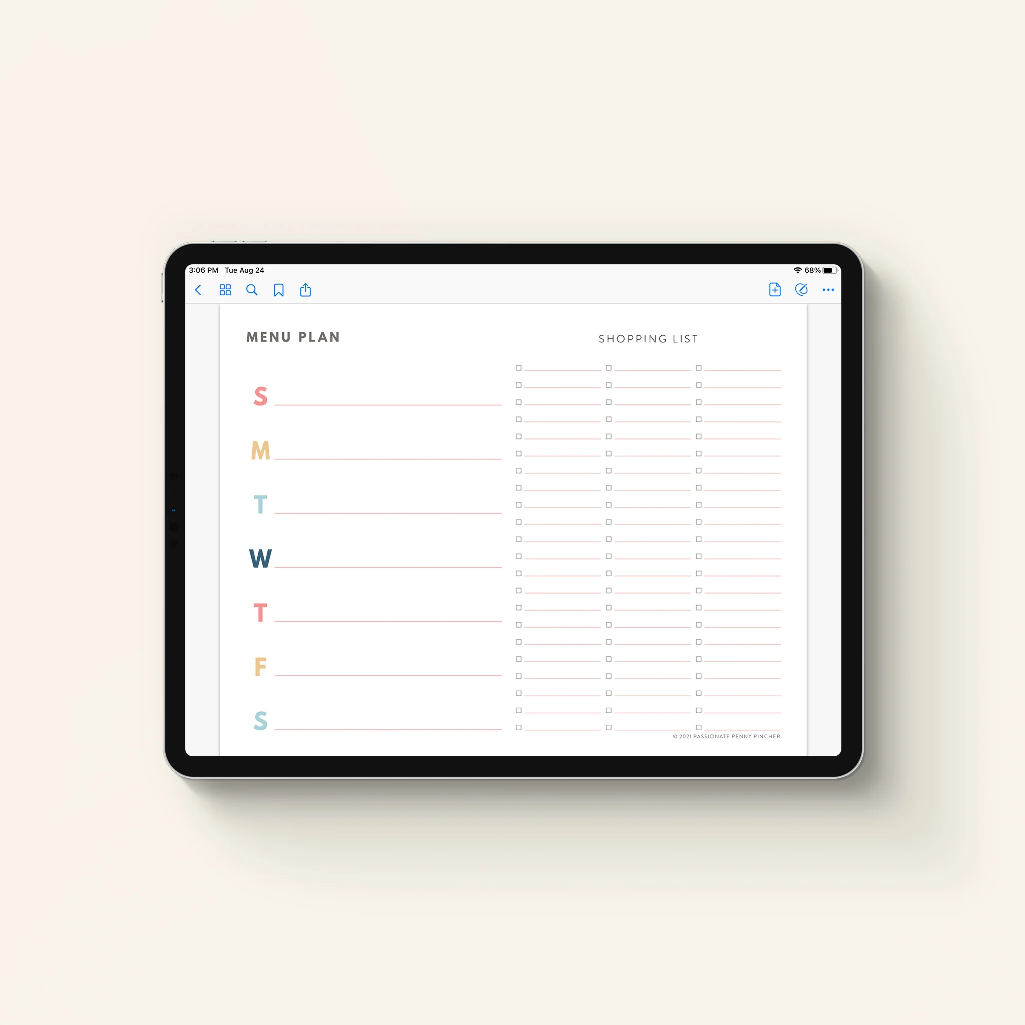 The Editable Menu Plan page is a great way to plan your weekly meals and keep track of necessary shopping items for the weekly meal planning.