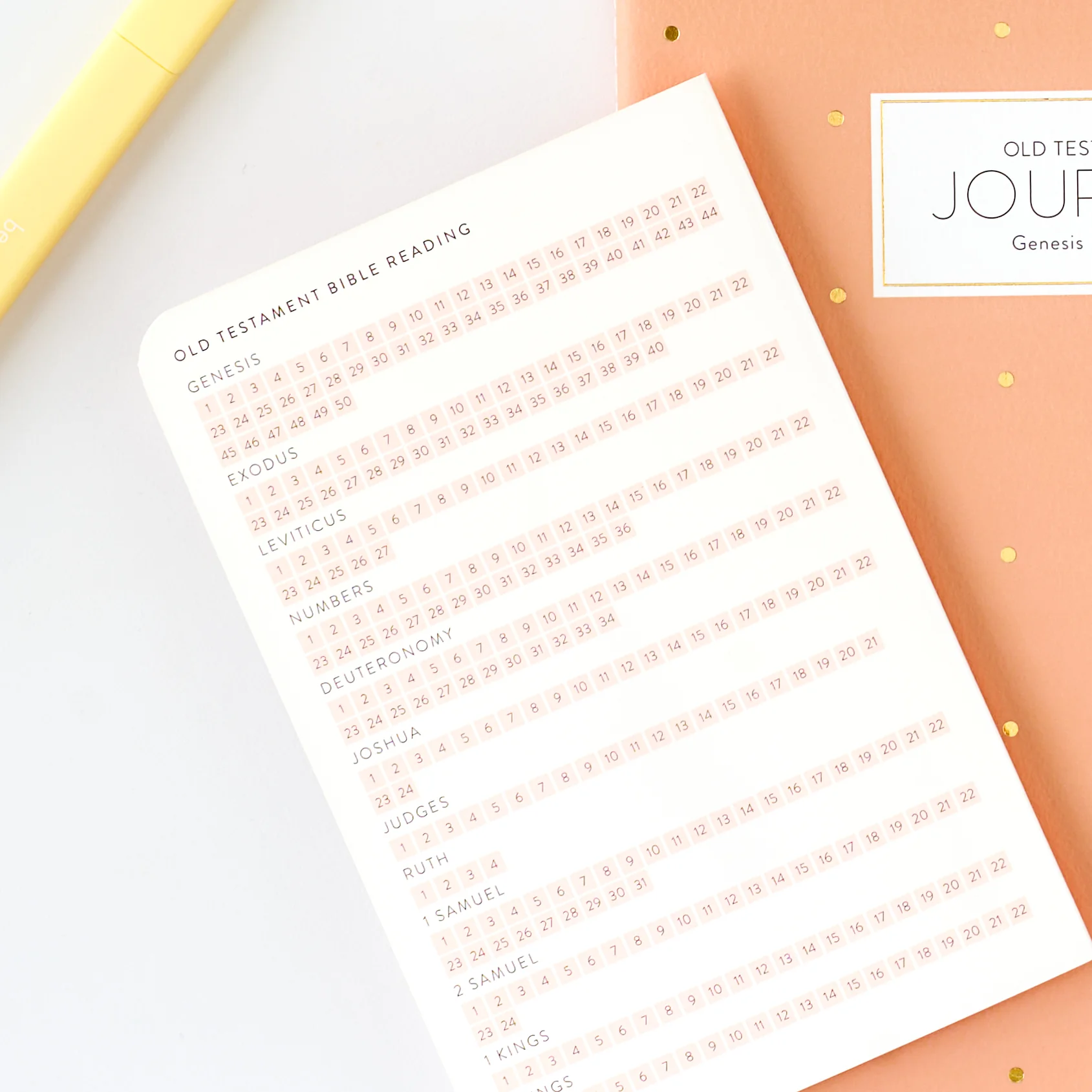 The Old Testament Journal is designed to help you deeply engage with scripture through journaling and reflection. Each journal contains a daily verse and prompts to guide your thoughts as you read through different passages of the Old Testament.