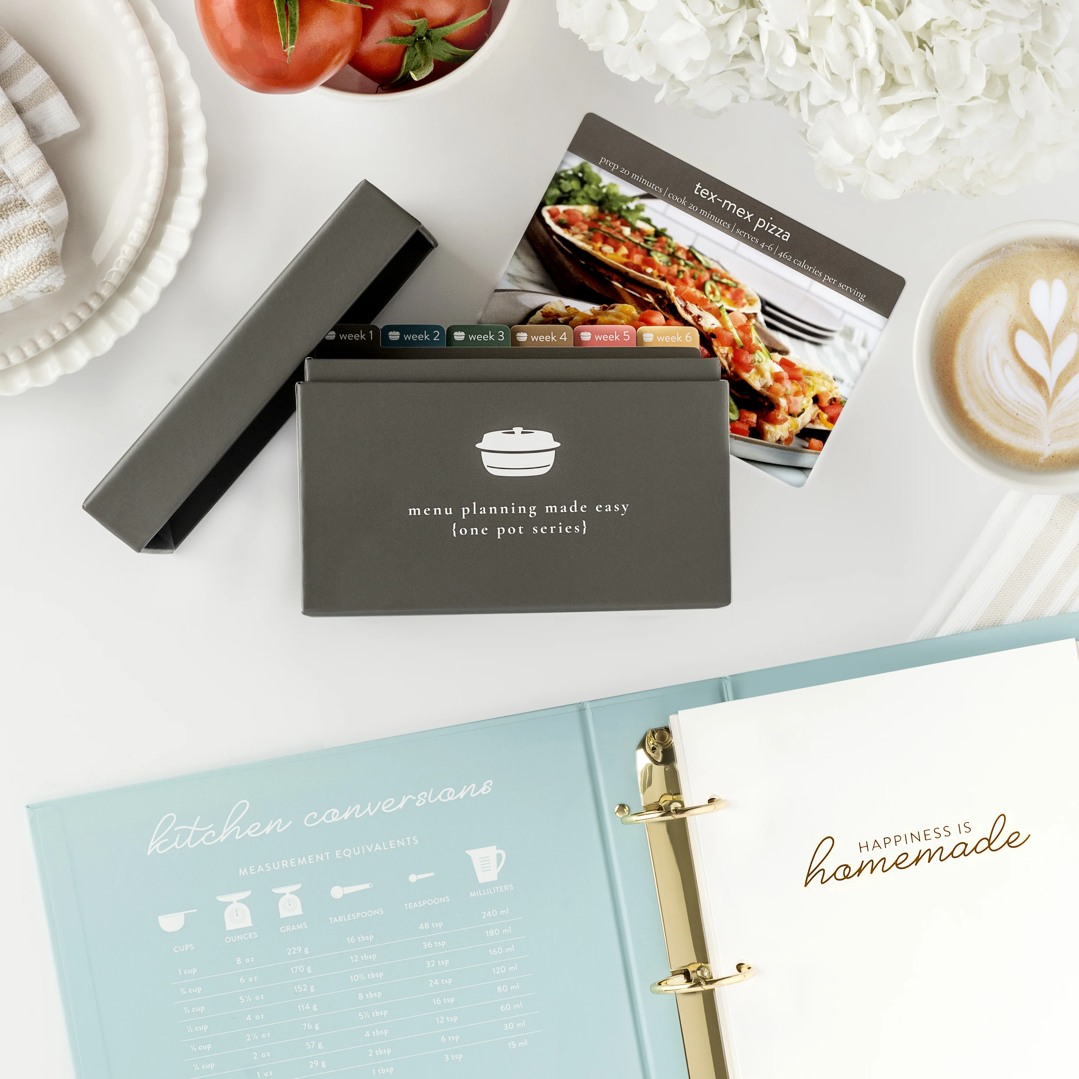Tired of scrolling Pinterest trying to figure out your weekly menu plan or nightly dinner recipe? The One Pot Kit by PPP is the ultimate solution! This simple kit includes everything you need in the palm of your hand to create effortless, delicious dinners at home. Our One Pot Menu Plan Box features 72 simple recipes, 12 weekly menu plans, and coordinating grocery lists, all neatly packed in one convenient box. You’ll also receive one of our classic Recipe Binders, in Happy Blue, which are perfect for organizing your one-pot recipes (or family favorites!) so you can easily see the pictures of each finished recipe.